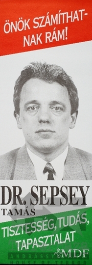 Poster for the parliamentary election of 1990. Dr. Tamás Sepsey, MDF parliamentary candidate. 'Honesty, knowledge, experience'